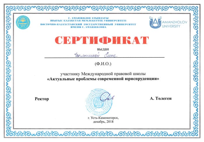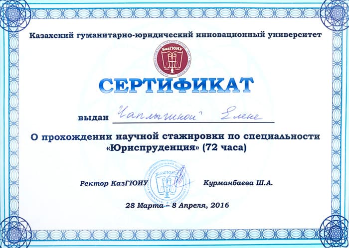 - Прошла стажировку по специальности «Юриспруденция» по теме различий в земельном законодательстве России и Казахстана.