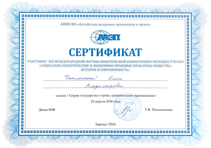 Сертификат участника международной правовой школы "Актуальные проблемы современной юриспруденции"