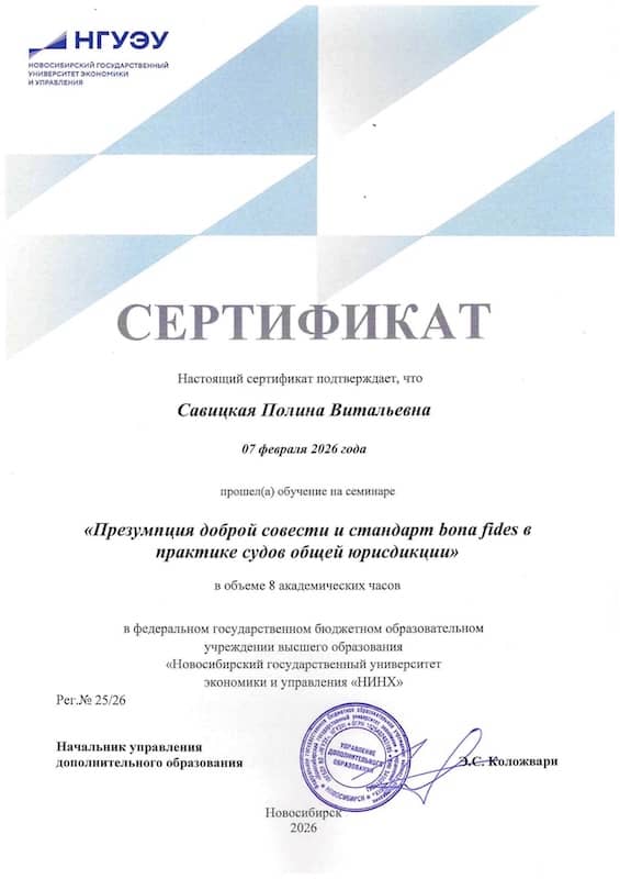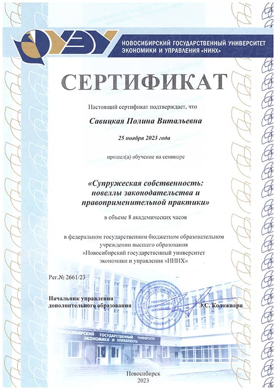 - Прошла дополнительное обучение по программе «Супружеская собственность: новеллы законодательства и правоприменительной практики».