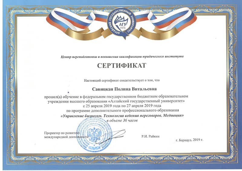 - Прошла дополнительное обучение по программе повышения квалификации «Управление бизнесом. Технология ведения переговоров. Медиация».