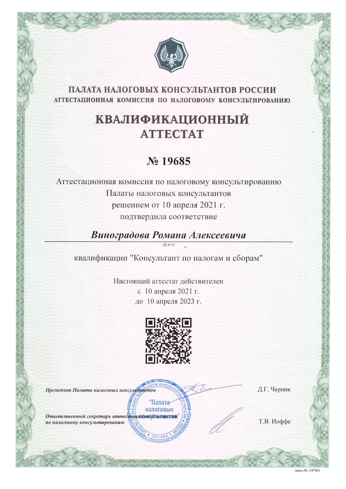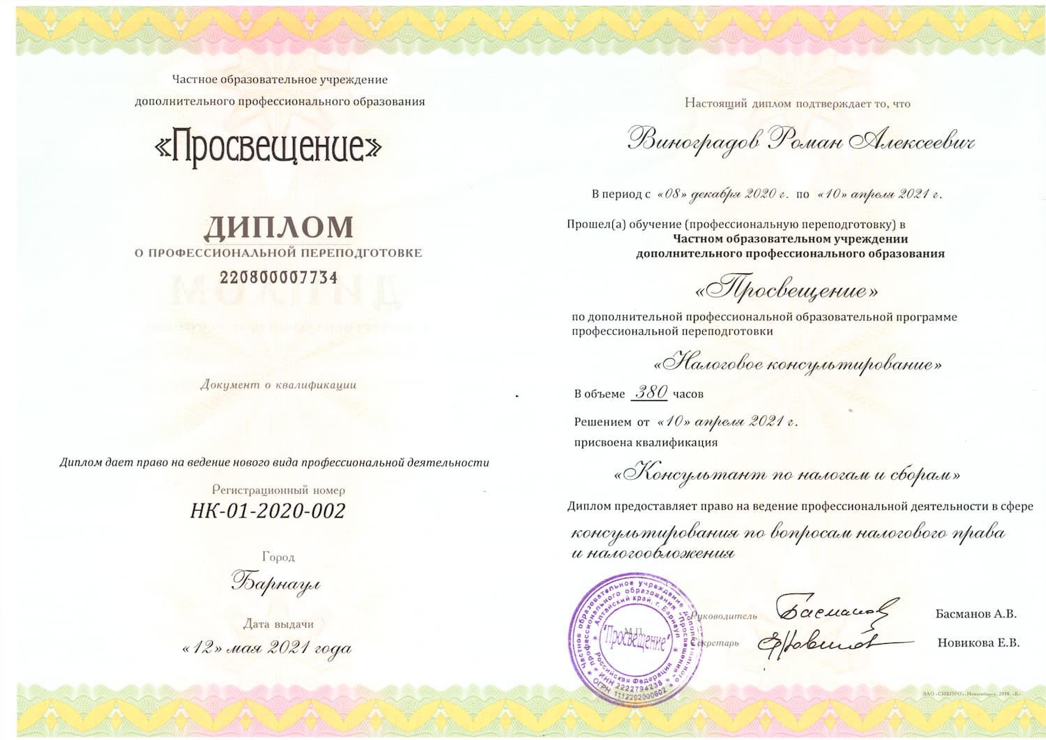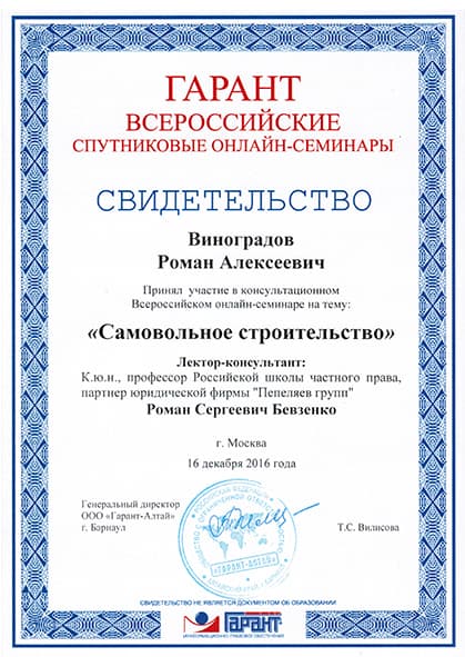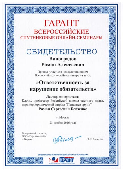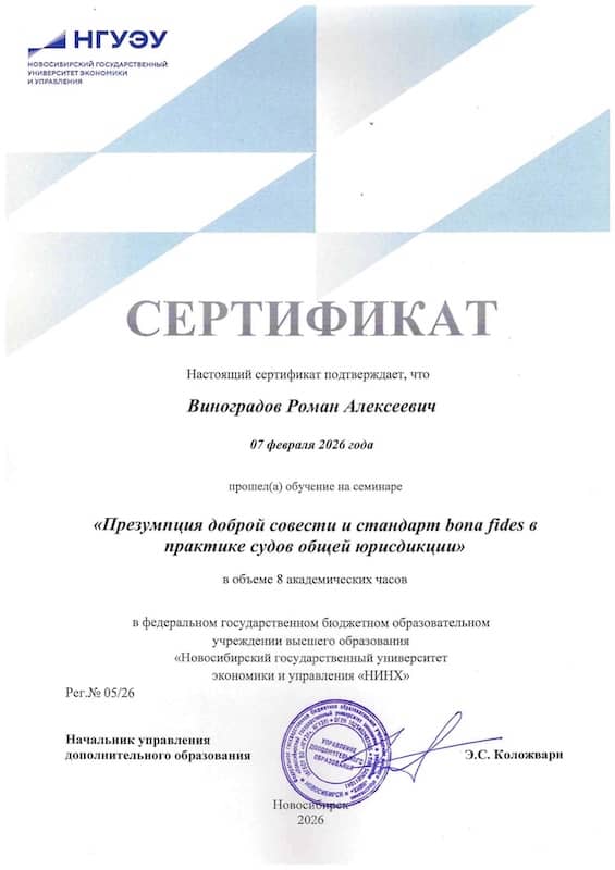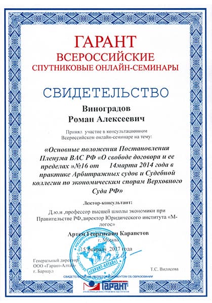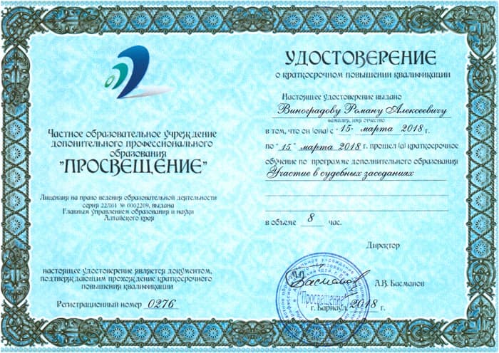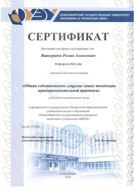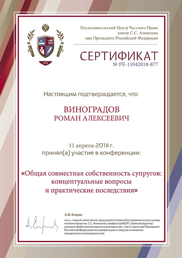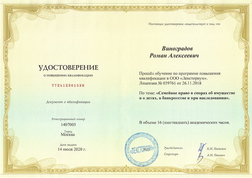 - Прошел дополнительное обучение по программам повышения квалификации «Доказывание в гражданском и арбитражном процессе», «Семейное право в спорах об имуществе и о детях, в банкротстве и при наследовании» и «Общая собственность супругов: новые тенденции правоприменительной практики».